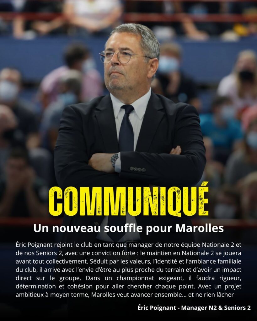 Arrivée d’un nouveau manager N2 équipe 2 à Marolles-en-Brie Eric Poignant. Marine : Vous venez d’arriver au club de Marolles-en-Brie en tant que manager. Qu’est-ce qui vous a convaincu de rejoindre ce projet ? Eric : Plein de choses….. Marolles-en-Brie est un club avec des valeurs fortes et une vraie identité. Avec aussi un vrai projet d’ici à 3/4 ans avec l’arrivée d’une nouvelle salle sur le territoire dont…